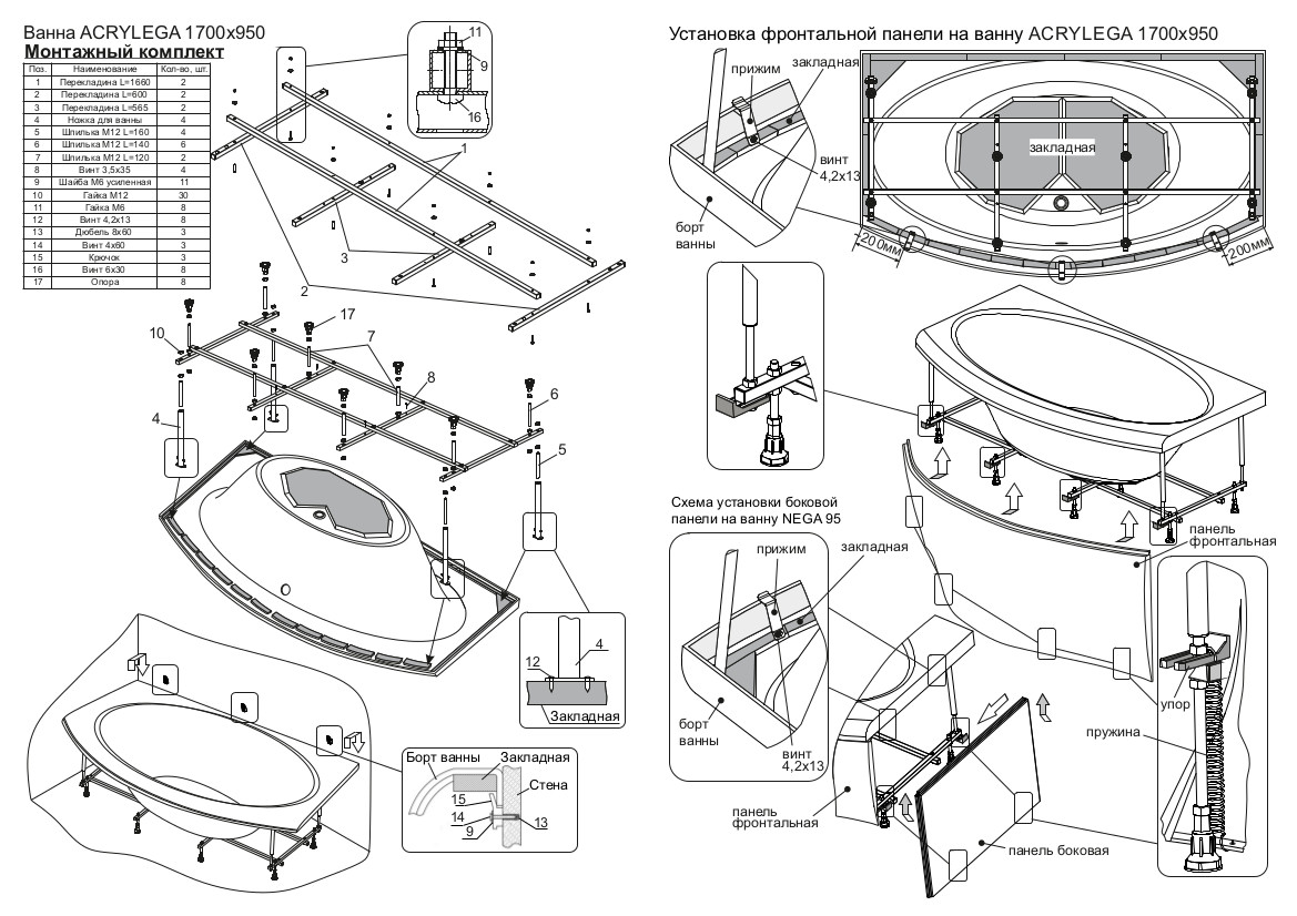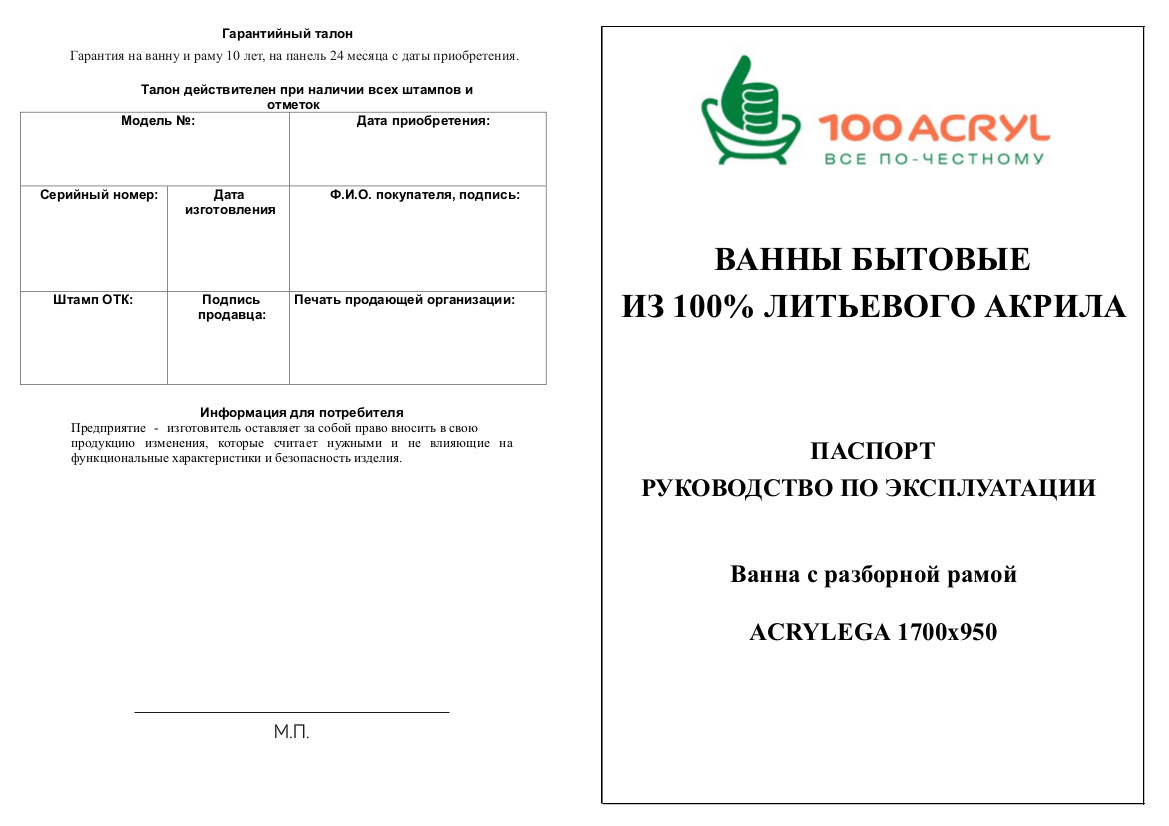 Ванна АКРИЛЕГА/ACRYLEGA 1700х950 ПР 100Acryl - ванны из 100% литьевого акрила собственного производства.